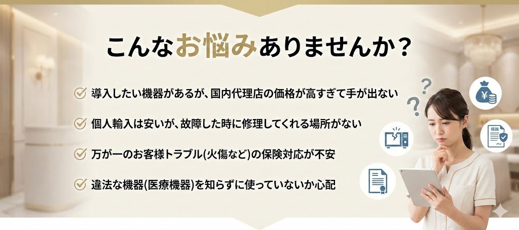海外の優れた美容機器を導入したい――しかし現実には、「薬機法(旧薬事法)」や「医師法」をはじめ、広告・保険・メンテナンスまで含めた“運用面の壁”が立ちはだかります。