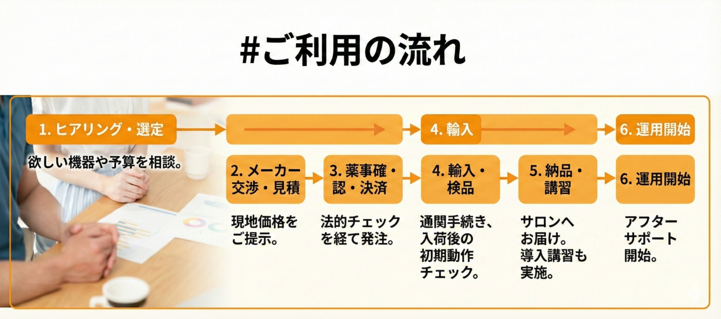 通関後の国内配送手配、サロン内への搬入、重量物の設置作業まで支援し、納品後すぐに運用開始できる状態を目指します。