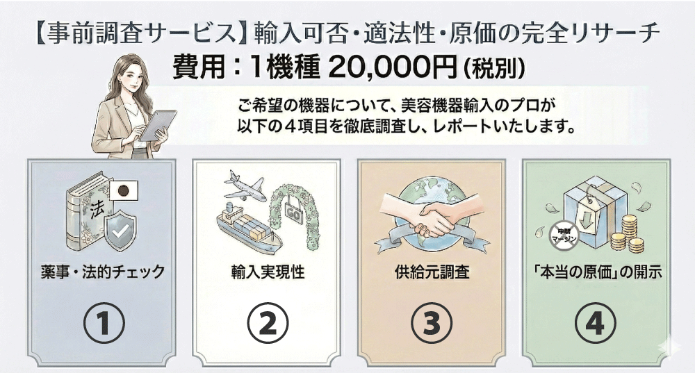 国内で適正に保守を受けるには、「雑品(美容機器)としての根拠資料」が提示できる状態であることが不可欠です。ここが曖昧だと、故障した瞬間にその機器は「高価な粗大ゴミ」と化します。