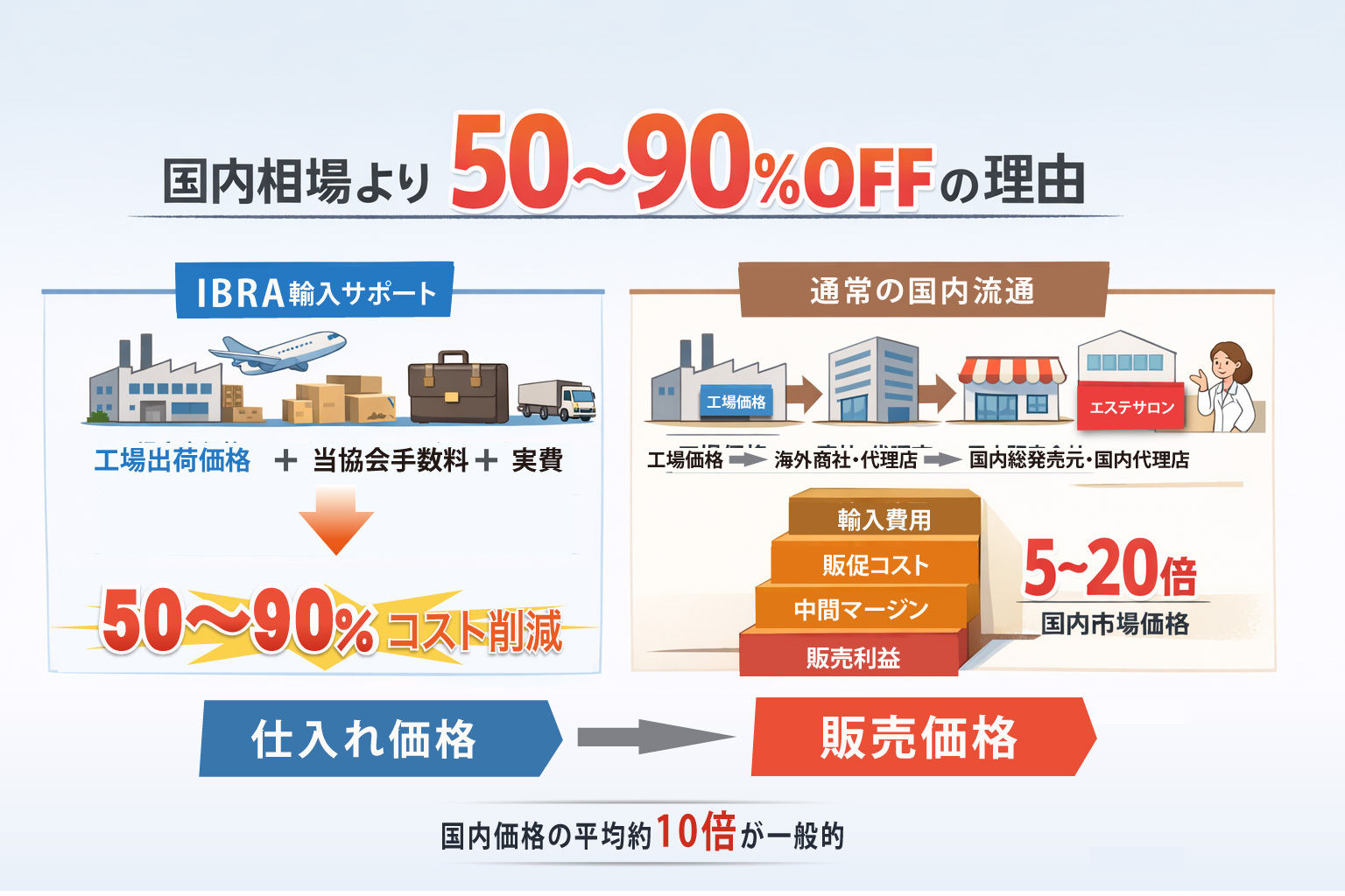 お客様にお支払いいただくのは、「海外工場の出荷価格(原価)」+「実費(輸送・通関等)」+「当協会の代行手数料」のみです。
