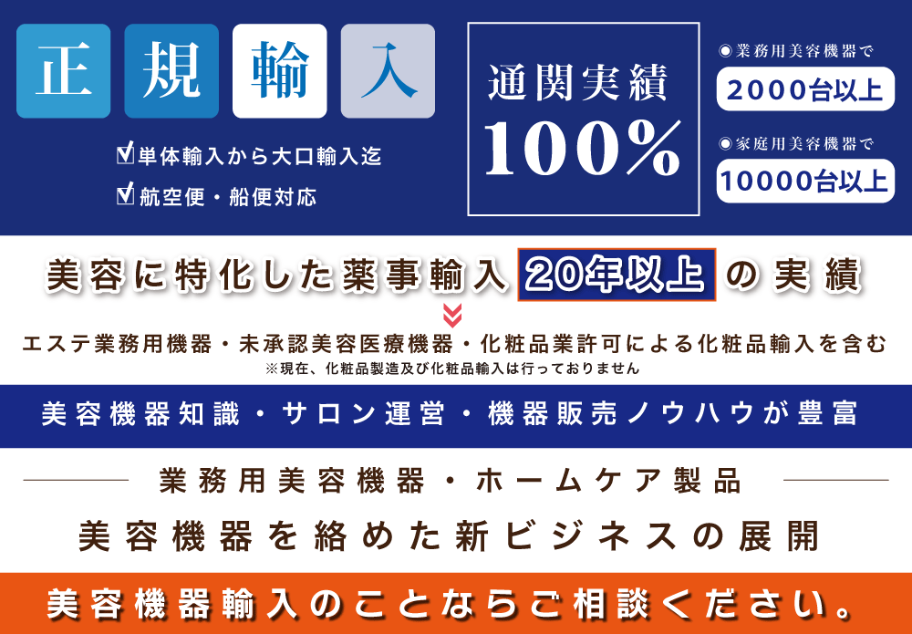 ◉美容機器正規輸入につき、事前に必要書類提出により税関で止まるということはなく、 納期も大幅に遅延することはありません。
